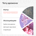 Тату дракона обладает особой энергетикой. Противоречивое мифическое животное олицетворяет силу, но иногда ярость и агрессию. При этом дракон изящен и красив. Такое необычное сочетание мы передали в аромате «Тату дракона». Вы услышите характерные кожаные ноты, которые утопают в сочном и нежном аромате цветущей вишни.